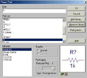 Pilih library yang sesuai dengan komponen yang kita inginkan. Sebagai contoh adalah komponen R (resistor). Library-nya adalah Analog, kemudian scroll (gulung ke bawah) pada Part list sampai ditemukan komponen R. Maka dialog akan tampak seperti gambar 8 di atas.