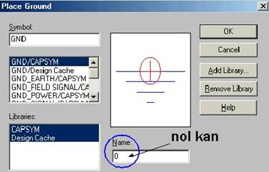 5. Terakhir, yang diperlukan adalah menambahkan Ground ke dalam skema rangkaian. Klik “Place Ground” (gambar 6). Akan muncul Dialog Place Ground seperti terlihat pada gambar 11. Ketika muncul dialog, pilih GND/CAPSYM dan berilah nilai 0 pada isian Name. Jangan lupa meng-nol-kan. Jika tidak PSpice akan memunculkan peringatan kesalahan ketika simulasi rangkaian dijalankan atau muncul peringatan “Floating Node”. Ini terjadi karena SPICE memerlukan terminal ground sebagai titik referensi yaitu 0 pada ground.