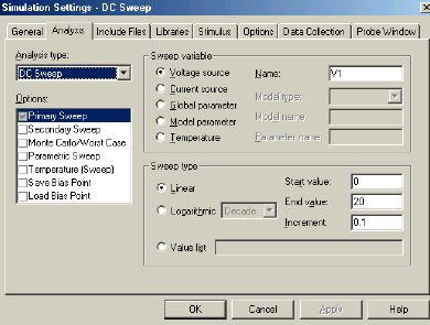 Tetap dipakai rangkaian yang sama, namun sekarang yang dievaluasi adalah pengaruh sweep tegangan sumber antara 0 dan 20V. Sumber arus 1 mA. Berikut langkah-langkah analisis DC sweep,