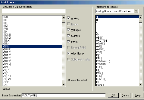 7. Pada probe window, tambahkan trace untuk tegangan input kemudian tambahkan jendela baru untuk memperlihatkan fase dan magnitude dari tegangan output. Tegangan dapat juga ditampilkan dalam bentuk dB dengan cara ketik Vdb(out) pada trace expression box dan ketik VP(out) untuk fasenya