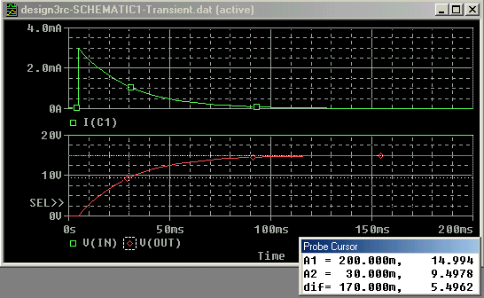 4. Jendela Probe pada PSpice akan membuka. Anda dapat menambahkan traces untuk memperlihatkan hasilnya. Pada Gambar 24 di bawah, kami memplot arus melalui kapasitor pada jendela atas dan tegangan melalui kapasitor bawah. Kami menggunakan kursor untuk menemukan konstanta waktu dari bentuk eksponensial (dengan menemukan perhitungan 0,632 x V(out)max = 9,48. Kursor akan memberikan waktu yang cocok yaitu 30 ms kemudian memberikan konstanta waktu 30-5=25 ms (5 ms dikurangkan karena switch menutuh pada 5 ms)