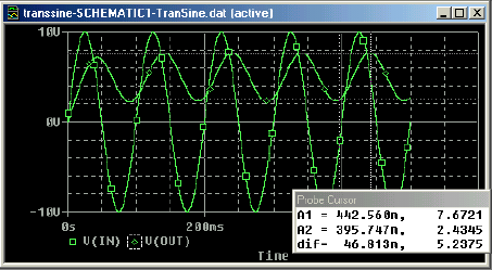 Nilai actual titik tertentu Vout dan Vin pada grafik juga dapat ditampilkan. Dari Trace  Cursor  Display. Di sini kursor berlaku sebagai trace pertama. Perhatikan kotak-kotak kecil grafik dan keterangan untuk V(out) di bagian bawah. Klik kiri pada trace 1, nnilai sumbu x dan y akan ditampilkan. Klik kanan pada V(out) maka nilai kursor akan ditampilkan.