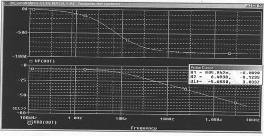 Gambar 28 menunjukkan, titik 3 dB mempunyai nilai frekuensi 6.49 Hz dengan time constant sebesar 25 ms [R1/(R2.C)]. Pada saat f=10Hz, Vout=11.4dB, dan seterusnya.