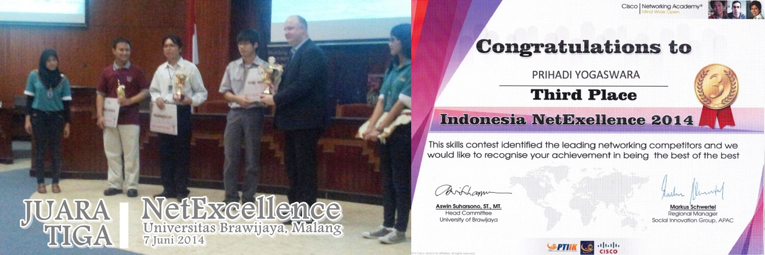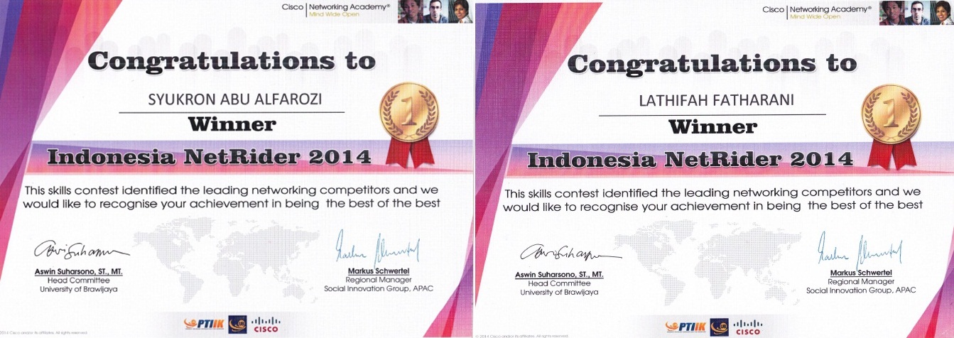 Mahasiswa Jurusan Teknik Elektro dan Teknologi Informasi, Fakultas Teknik, UGM yang diwakili oleh SYUKRON ABU ISHAQ ALFAROZI dan LATHIFAH FATHARANI kembali meraih prestasi di ajang Netriders 2014 sebagai Juara I. Selain itu, PRIHADI YOGASWARA juga meraih Juara 3 Netexcellence 2014.
