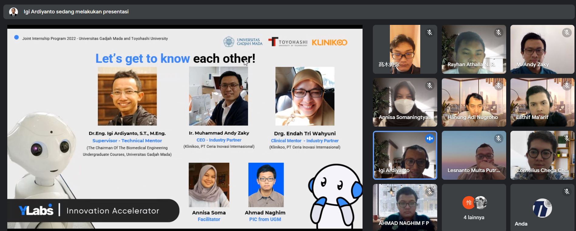 Pada hari Senin, 10 Januari 2022 Departemen Teknik Elektro dan Teknologi Informasi (DTETI) Universitas Gadjah Mada bersama dengan Toyohashi Univ. Tech (TUT) Jepang, dan YLabs melaksanakan pertemuan daring guna melaksanakan kickstart join internship antar institusi, yang dihadiri oleh beberapa perwakilan dari masing-masing institusi di antaranya: Prof. Jun Miura, Yuya Takagi, Ryo Inagaki, perwakilan dari DTETI, dan YLabs (sebagai pengembang platform Klinikoo).