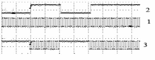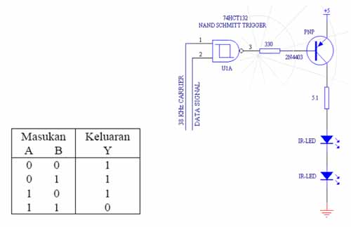 Carrier 38KHz adalah gelombang kotak  (”1″ dan “0″) dengan frekuensi 38.000 siklus per detik. Sedangkan data serial adalah 1200 atau 2400 bps (bit per detik), dan kecepatan ini jauh lebih lambat dibandingkan dengan frekuensi carrier 38KHz. Output NAND (#3) dapat dilihat pada gambar berikut. Sedangkan pancaran LED infra merah adalah kebalikan (NOT) dari #3.