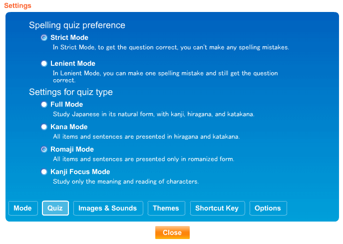 Untuk memulai sesi baru, klik saja tombol kuning “Start”. Namun kalau kamu sudah merasa cukup untuk hari ini, tinggal tekan “Quit” dan kamu bisa melanjutkannya di hari lain. Untuk mengubah mode romaji/kana/full, tinggal tekan “Settings” lalu pilih tab “Quiz”: